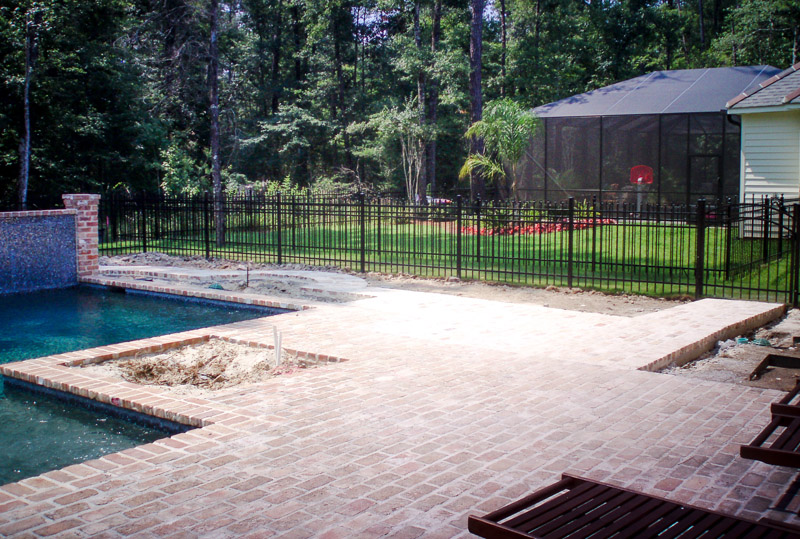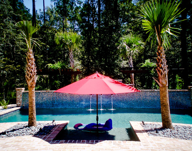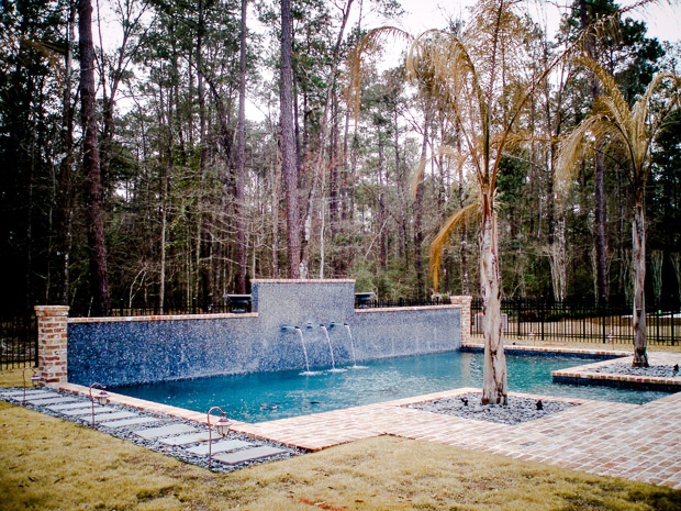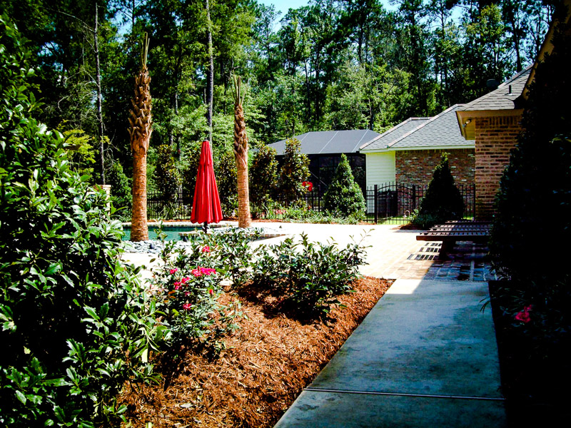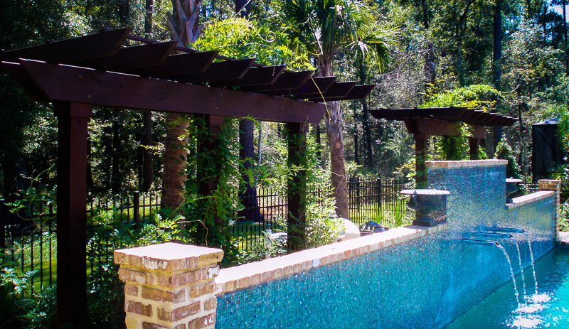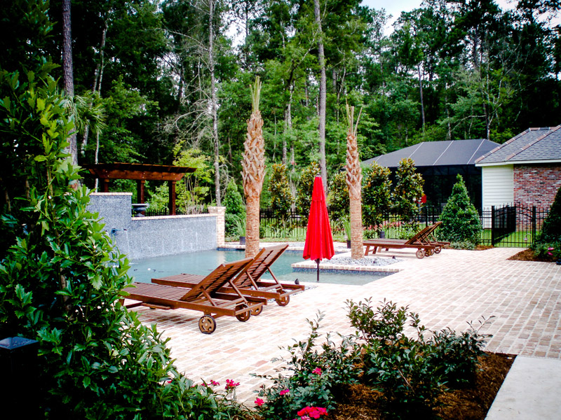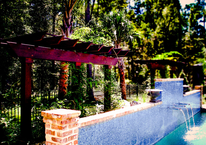 This space was designed to reflect a New Orleans courtyard-style garden and pool. The clients desired a sense of enclosure, yet wanted to retain views of the surrounding woodlands. The garden design achieved this through the incorporation of recycled brick and flagstone in constructing a new patio and pathways. Water flows into the client's pool from copper troughs set in glass tile and brick, creating an attractive focal point. The addition of wisteria-draped arbors provided a balanced backdrop to create the desired courtyard ambiance. Little Gem magnolias provided enclosure while preserving the view, and we blended formally maintained shrubs with palms to create a perfect New Orleans ambiance.